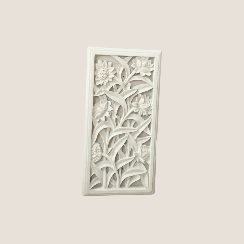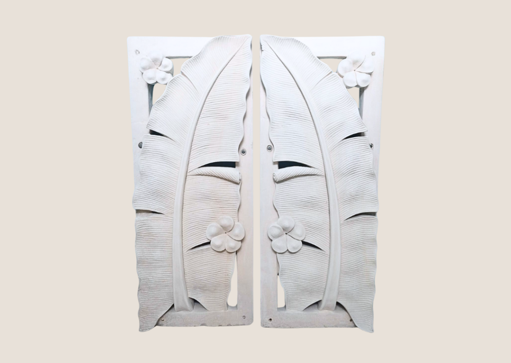 Each panel in this exquisite set features a beautifully carved banana leaf and flower, designed to complement each other when displayed side by side. The intricate detailing and graceful composition bring a touch of tropical charm and refined artistry, perfect for enhancing the ambiance of any room or outdoor setting.