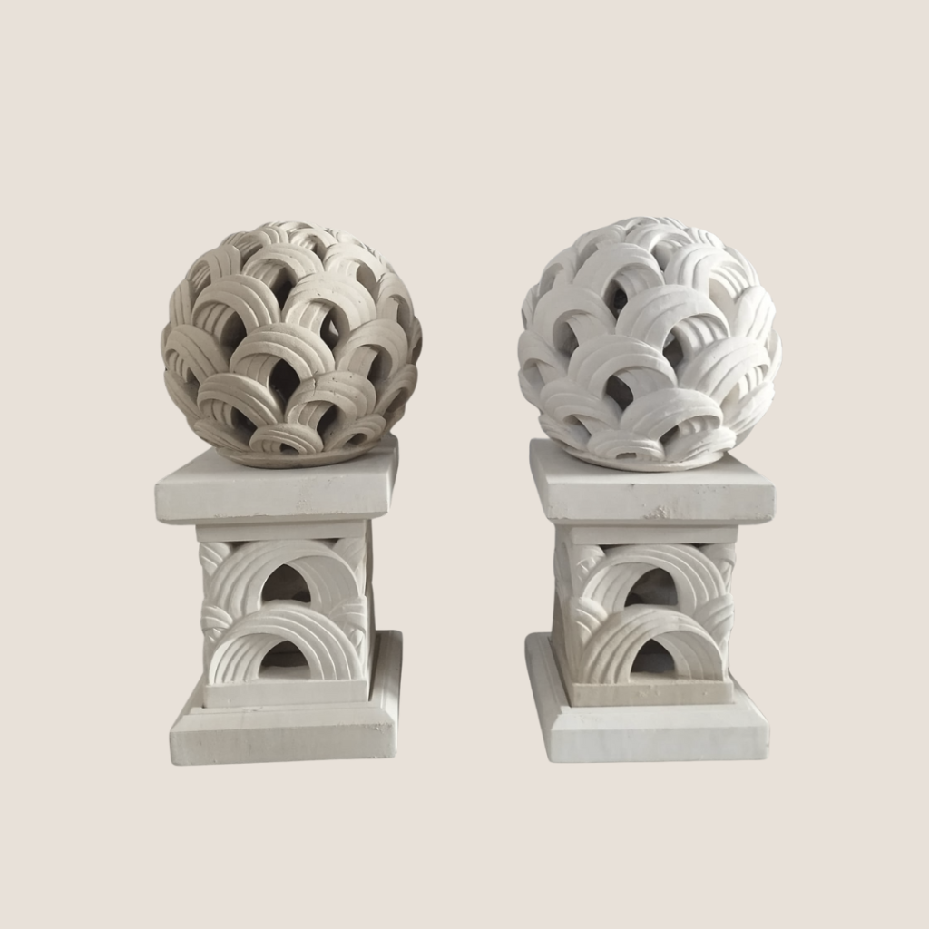 Introduce a touch of elegance to your space with our Carved Design Plinths with Round Balls. These two beautifully crafted pieces feature intricate carved designs on the plinths, each crowned with a smooth, round ball. Ideal for adding sophistication and refined charm, these statues enhance any setting with their harmonious and decorative presence.