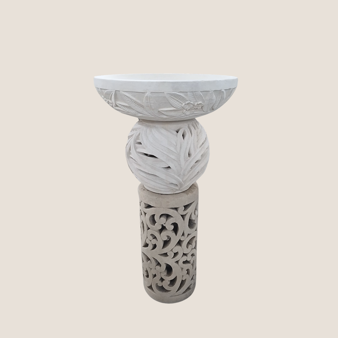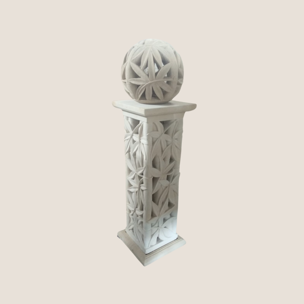 Elevate your space with the elegant charm of our Jepun Plinth with Round Bowl. This exquisite piece features a beautifully designed plinth adorned with intricate flower carvings, supporting a equally decorated, round bowl on top. Perfect for adding a touch of natural beauty and sophistication, this statue brings a refined and decorative ambiance to any space.