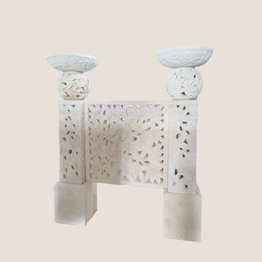 This impressive piece features a beautifully detailed carved panel, flanked by two elegantly designed plinths. Perfect for making a bold statement and adding a touch of sophistication, this entrance set creates a stunning and welcoming focal point for any grand entrance or garden.